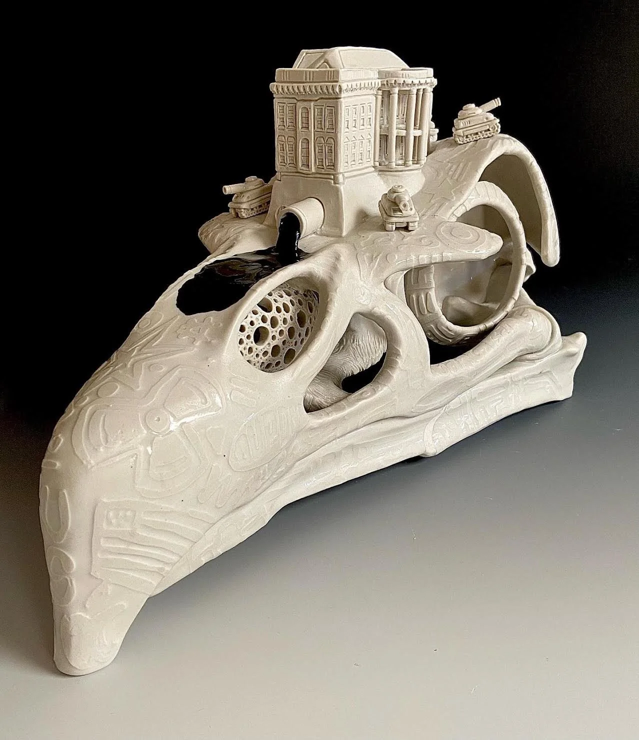 Evan Hobart’s Anti Hero continues his exploration of humanity’s imprint on the world, rendered here in stark, all-white ceramic. The sculpture takes the form of a dinosaur head, its surface etched with classic American symbols—stars, stripes, and fragments of the flag—while tiny tanks crawl across its scales and atop the White House that perches precariously on its crown. The juxtaposition of this iconic architecture with the primeval form and miniature military machines creates a tense, surreal commentary on power, legacy, and national identity. Every mark on the surface—every scale, emblem, and indentation—carries Hobart’s meticulous attention to craft, transforming a playful, almost fantastical image into a meditation on the outsized influence of institutions and human activity over both history and the natural world.