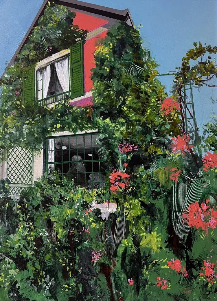 Orin Carpenter's "Artist's Garden" (2023) is a 40 x 30 inch acrylic painting from his "Requiem to Claude Monet" series, which he started after visiting Monet's gardens at Giverny. It is a response to that experience filtered through Carpenter's own layered, mixed-media approach - brushstrokes and glazes sit alongside collaged elements and text. Carpenter's broader practice, seen across his series "Breathing Through Change" and "Fractured Souls," is always about using layers to get at something true about identity and experience. Here that instinct is applied to a very different subject, and the result is a painting that honors Monet while being unmistakably Carpenter's own.