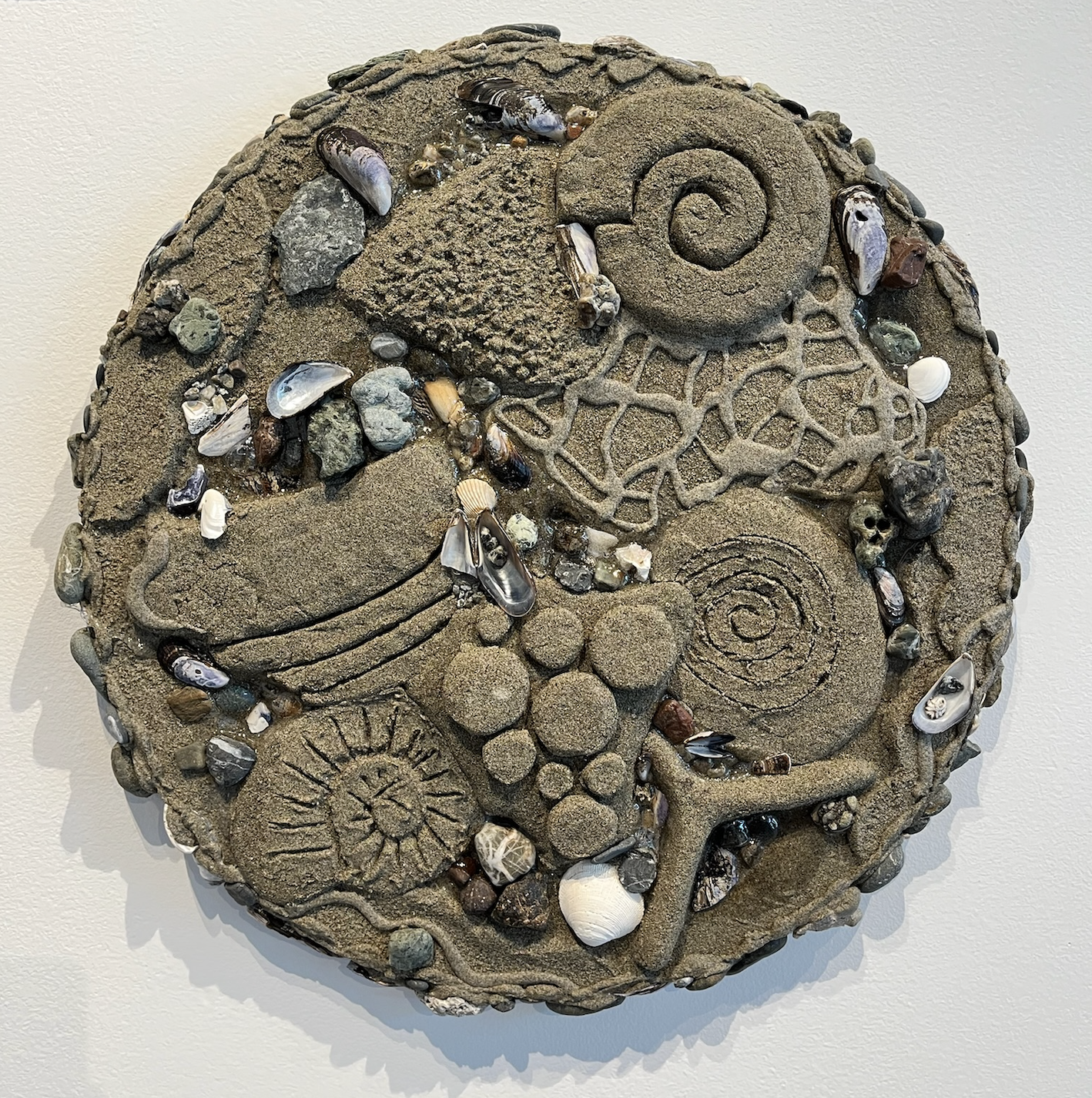 sand, soil, gesso, acrylic medium, shells, and rocks on carving block