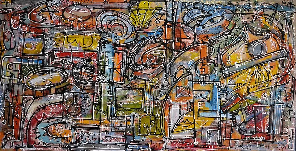M’s Wild Time pulses with joy and movement, a vibrant exploration of adventure through Amir’s signature abstract language. Reds, blues, and yellows swirl across the canvas, with shapes that hint at eyes, arches, or fleeting traces of human presence, yet remain firmly in the realm of abstraction. The composition feels alive and improvisational, like a journey unfolding in real time, full of twists, turns, and unexpected discoveries. Amir’s work invites us to surrender to the experience, embracing the energy, spontaneity, and delight in the story the shapes and colors tell, celebrating the thrill of exploration and the poetry in motion.