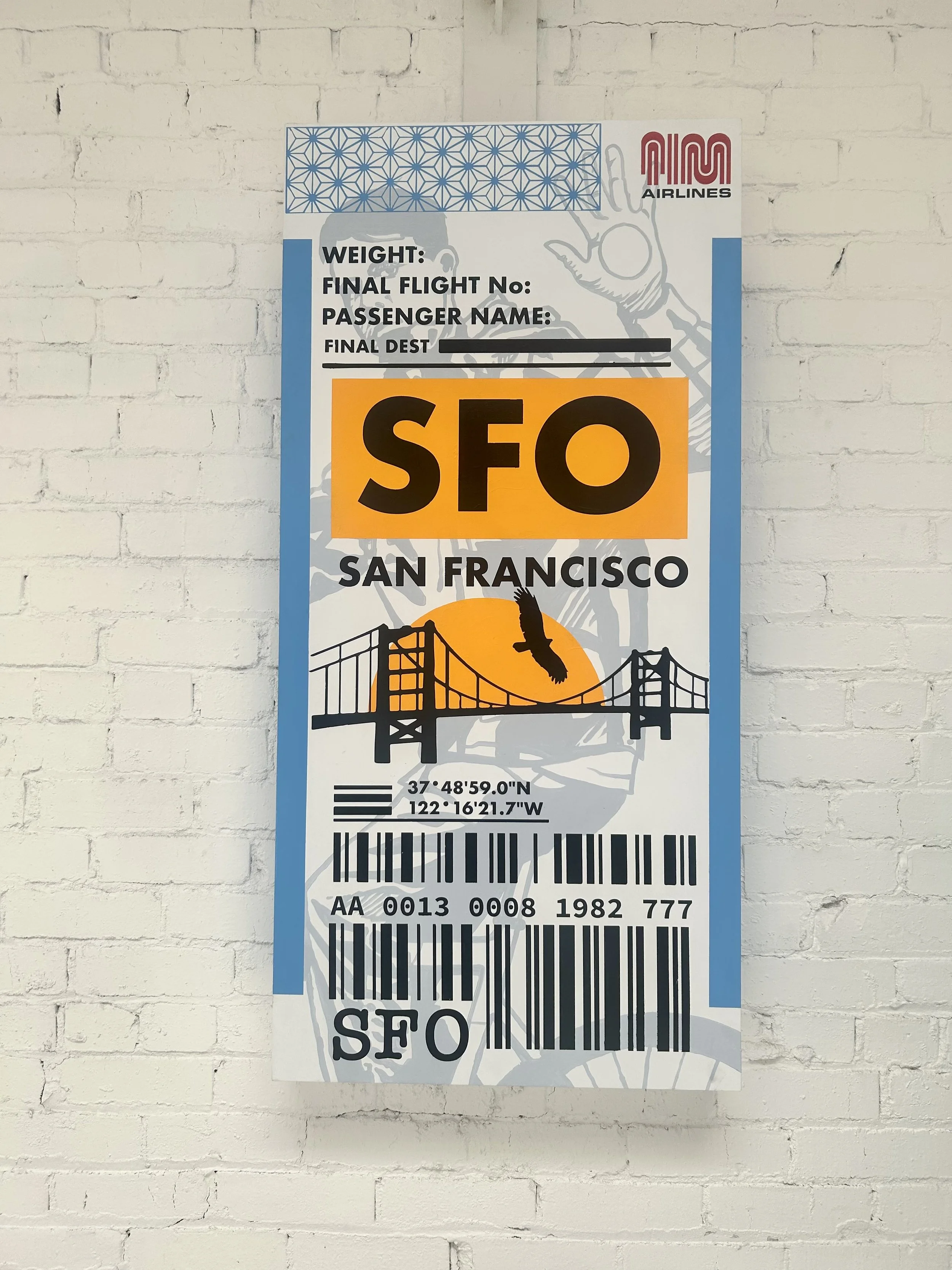 San Francisco is part of Tim Williams’s Travelin’ Man series, where each ticket reflects a journey and carries anecdotes from his travels. Born to an Irish mother and Russian father with CIA ties, his early life was shaped by global movement and complex family dynamics. In 2007, he left the U.S. for Taiwan, where the culture and vibrant graffiti scene transformed his life and artistic practice. This ticket features a self-portrait of Williams on a bike, his hand rendered as Iron Man’s—a nod to his love of comics and pop-art influences. The SFO airport code anchors the piece, alongside the Golden Gate Bridge, the Muni logo, a California condor, and the coordinates of the Bay. The work captures his personal energy while honoring San Francisco as the place he will always return to, always calling it home.