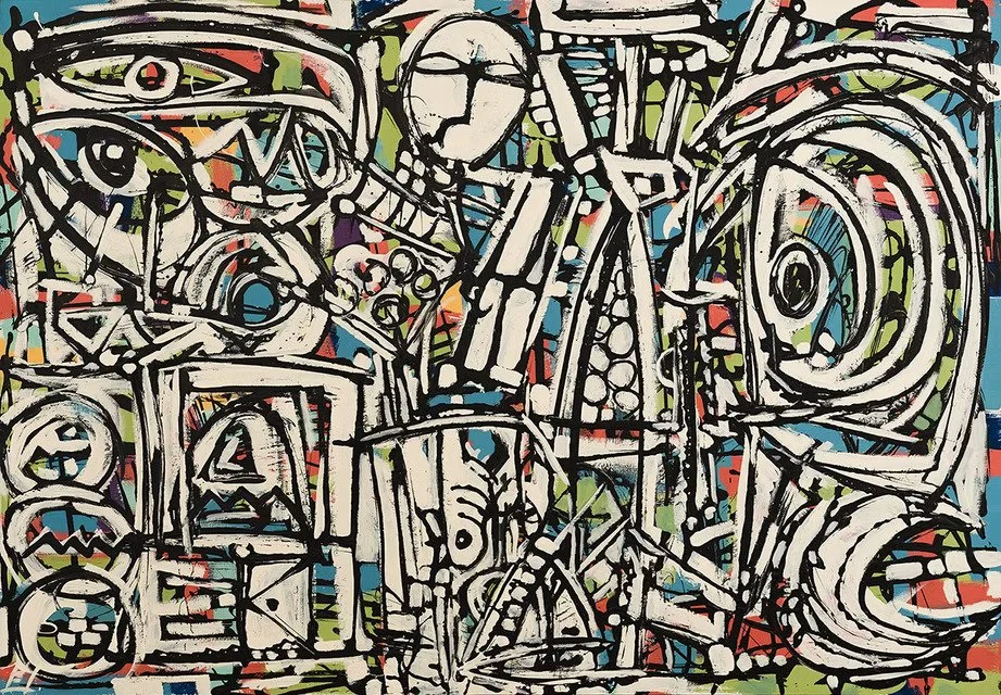 Oceanic 2 is a breathtaking pivot within Amir's practice, one often defined by precision and structure. While his background as an engineer informs much of his work’s angular, linear energy, here Amir embraces the fluidity and unpredictability of the sea. In cool tones, abstracted figures, eyes, spirals, and swirls collide like currents in motion. The composition feels beautifully chaotic, almost like jazz improvised in real time—each gesture responsive, alive, and free. Oceanic 2 invites us to recognize life’s inherent messiness not as disorder but as a richness to be felt. Like a wave we cannot predict or control, this work asks us to let go and simply ride, surrendering to the poetry in flux and the joy in beautiful chaos.
