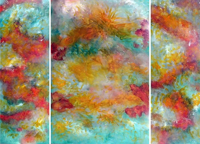 The Dance In You is a quiet yet expansive celebration of vitality and movement, unfolding across three panels as a continuous rhythm. Warm, earthy tones drift and gather, creating moments that feel like gentle bursts of energy. In person, the palette is far softer than photographs suggest, with sun-washed yellows, muted greens, and glowing oranges balanced by cooler passages of blue that allow the work to breathe. These warm moments recall the organic beauty of sunflowers, echoing cycles of growth, light, and renewal. The triptych format reinforces the idea that this celebration of life cannot be contained within a single frame, as energy flows freely from panel to panel, inviting extended looking and quiet reflection.