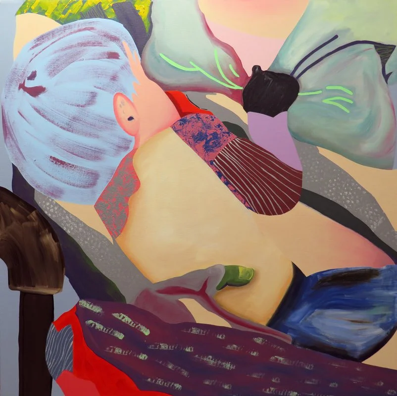 Jennifer Lugris's "When Life Hands You Lemons" (2023) is a 36 x 36 inch canvas made with oil and acrylic. The subject is exactly what the title says - lemons, painted in bright yellows against a patterned background. Lugris is a Sacramento-based artist of Uruguayan, Korean and Spanish descent who paints vibrant, pattern-heavy scenes drawn from everyday life. Plants and food in her work tend to carry meaning - here, the lemon is about turning something difficult into something useful. Lugris holds an MFA from UC Santa Barbara, has received a National Endowment for the Arts grant, and her work is in permanent collections at the Hawaii State Foundation on Culture and the Arts, Facebook and UC Davis Health.